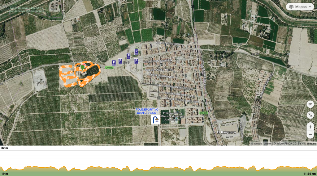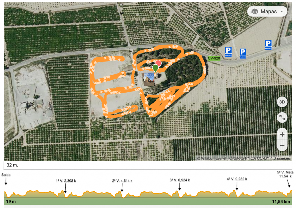 El circuito se sitúa en la explanada de una pequeña colina del Paraje Natural denominado Ermita de Algorfa, entre cultivos y huertos de naranjos, en la CV-920 de Algorfa a Benijófar. El recorrido, consta de una distancia de 2,308 km con escasos 7 m. de desnivel positivo, donde se darán las vueltas necesarias para adaptar a las distancias reflejadas en el Reglamento FEMECV de Marcha Nórdica vigente, según las categorías y subcategorías (ver apartado anterior de Categorías y Distancias)